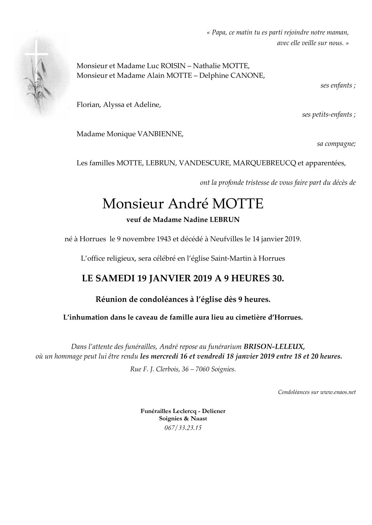 Died in Neufvilles (7063) on 14 January 2019 at the age of 75 years