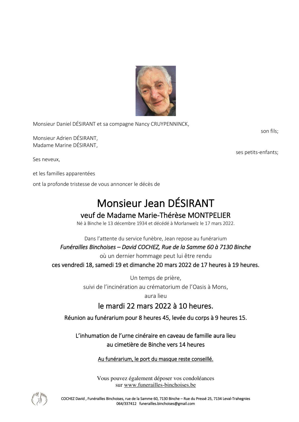 Décédé à Morlanwelz (7140) le jeudi 17 mars 2022 à l'âge de 87 ans