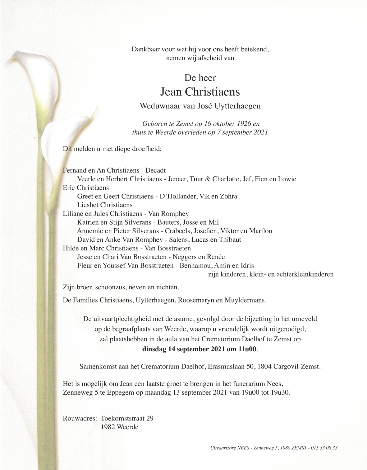 Décédé à Weerde (1982) le mardi 7 septembre 2021 à l'âge de 94 ans