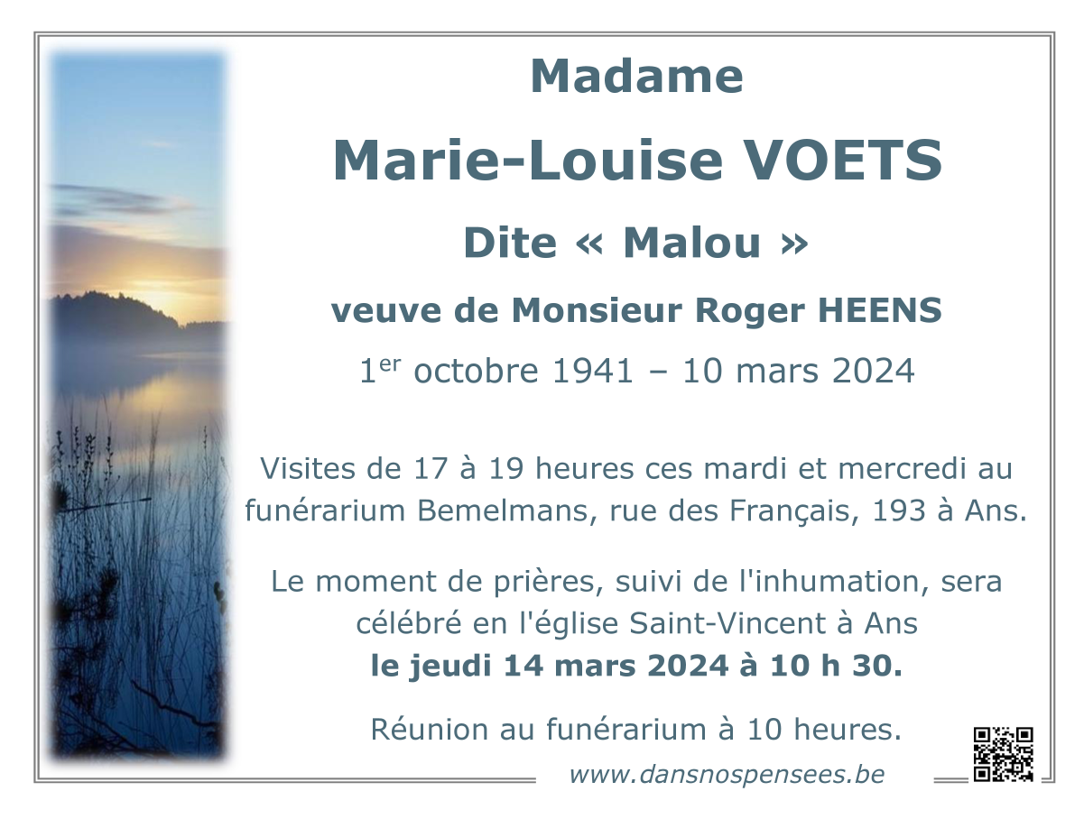 Décédée à Liège (4000) le dimanche 10 mars 2024 à l'âge de 82 ans