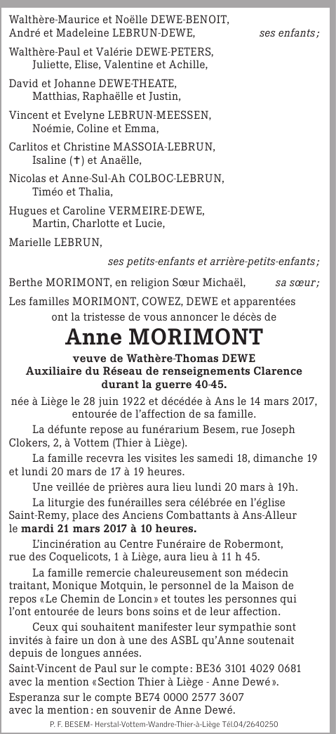 Overleden te Ans (4430) op dinsdag 14 maart 2017 op 94-jarige leeftijd