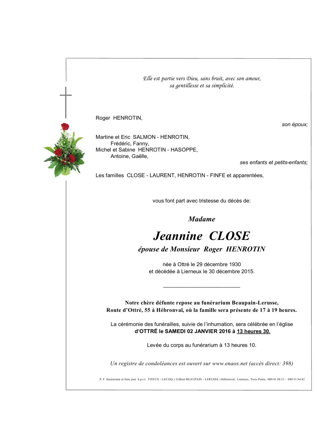 Fallecida en Lierneux (4990) el miércoles, 30 de diciembre de 2015 a la edad de 85 años