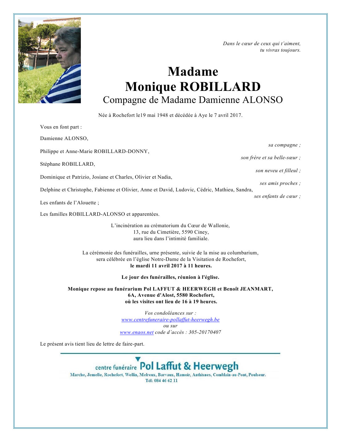 Décédée à Aye (6900) le vendredi 7 avril 2017 à l'âge de 68 ans