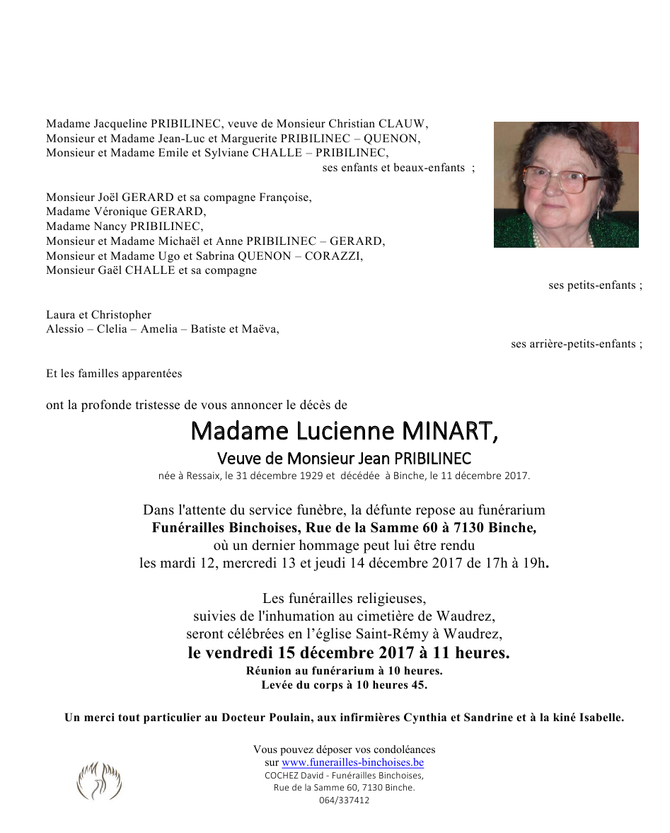 Fallecida en Binche (7130) el lunes, 11 de diciembre de 2017 a la edad de 87 años