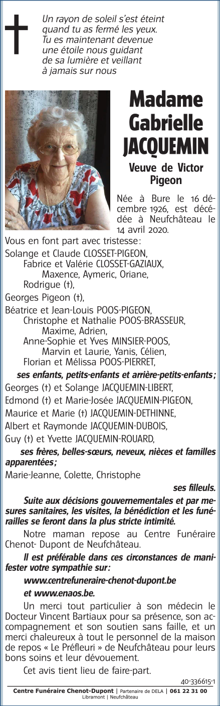 Died in Neufchâteau (6840) on 14 April 2020 at the age of 93 years