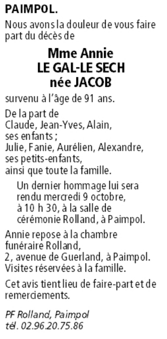 Décédée à Paimpol (22500, France) le jeudi 3 octobre 2024 à l'âge de 91 ans
