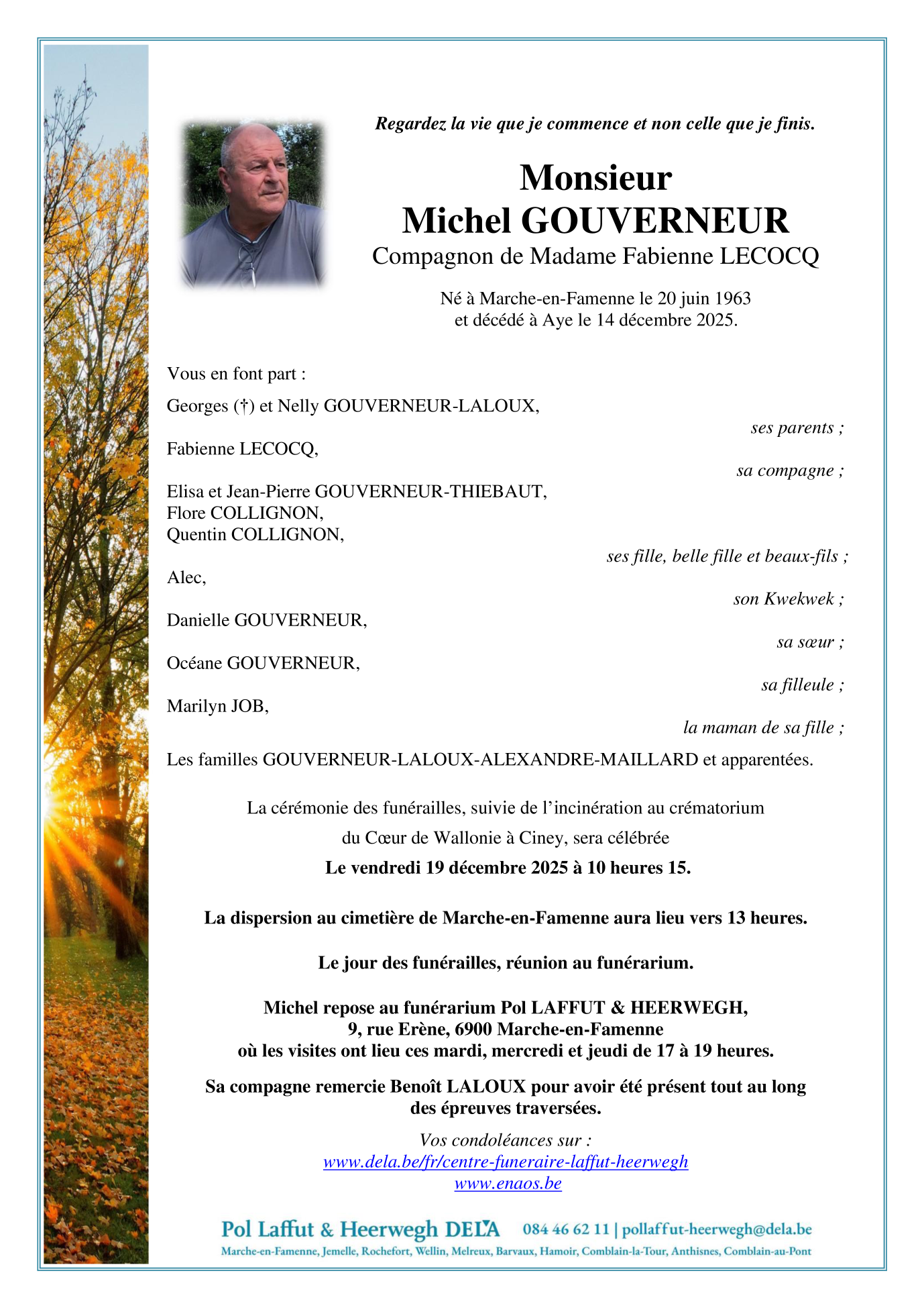 Décédé à Aye (6900) le dimanche 14 décembre 2025 à l'âge de 62 ans
