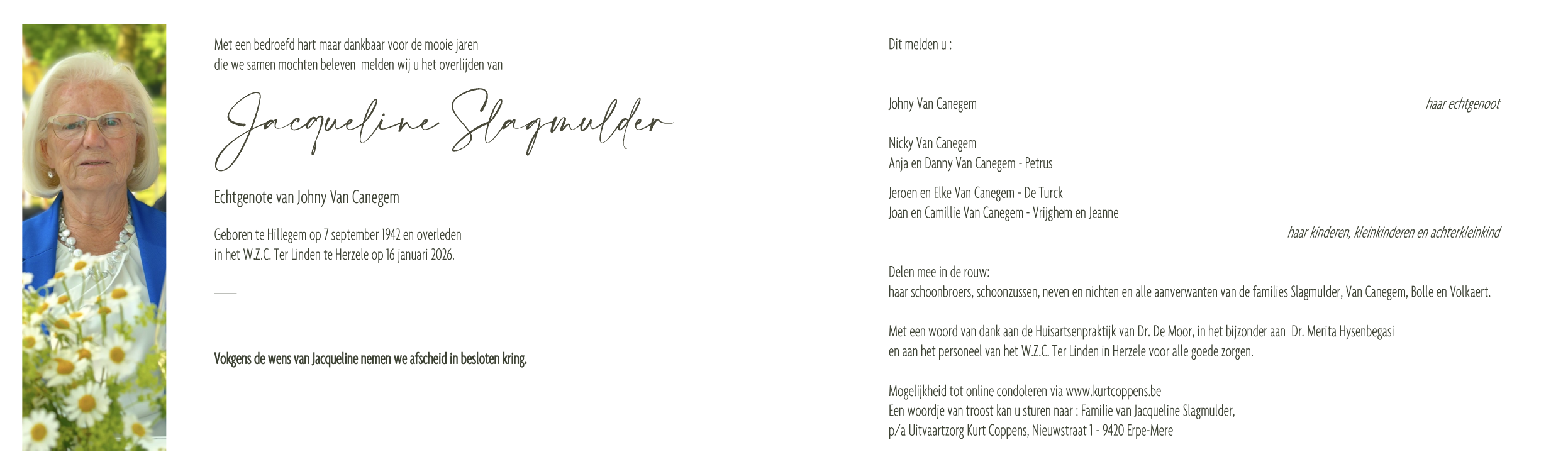 Décédée à Steenhuize-Wijnhuize (9550) le vendredi 16 janvier 2026 à l'âge de 83 ans