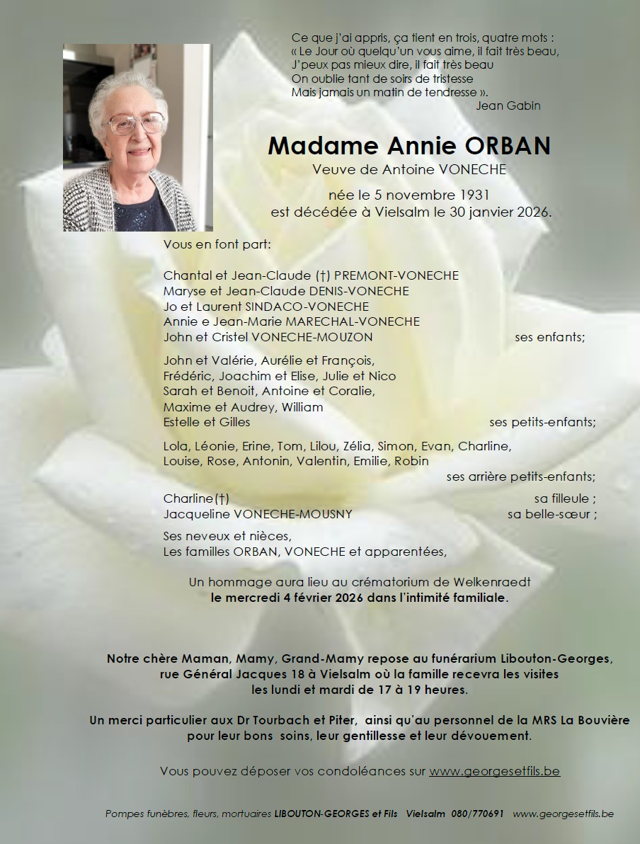 Madame Annie ORBAN veuve de Antoine VONECHE