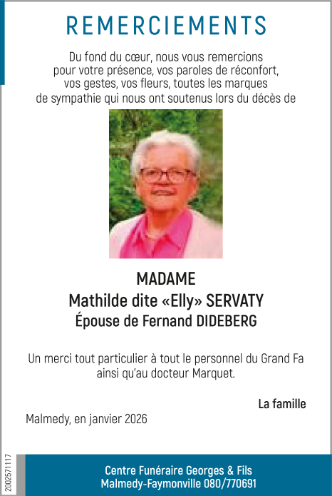 Décédée à Malmedy (4960) le vendredi 16 janvier 2026 à l'âge de 91 ans
