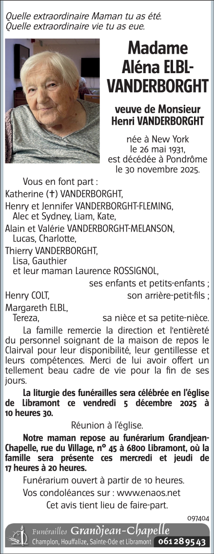Died in Pondrôme (5574) on 30 November 2025 at the age of 94 years
