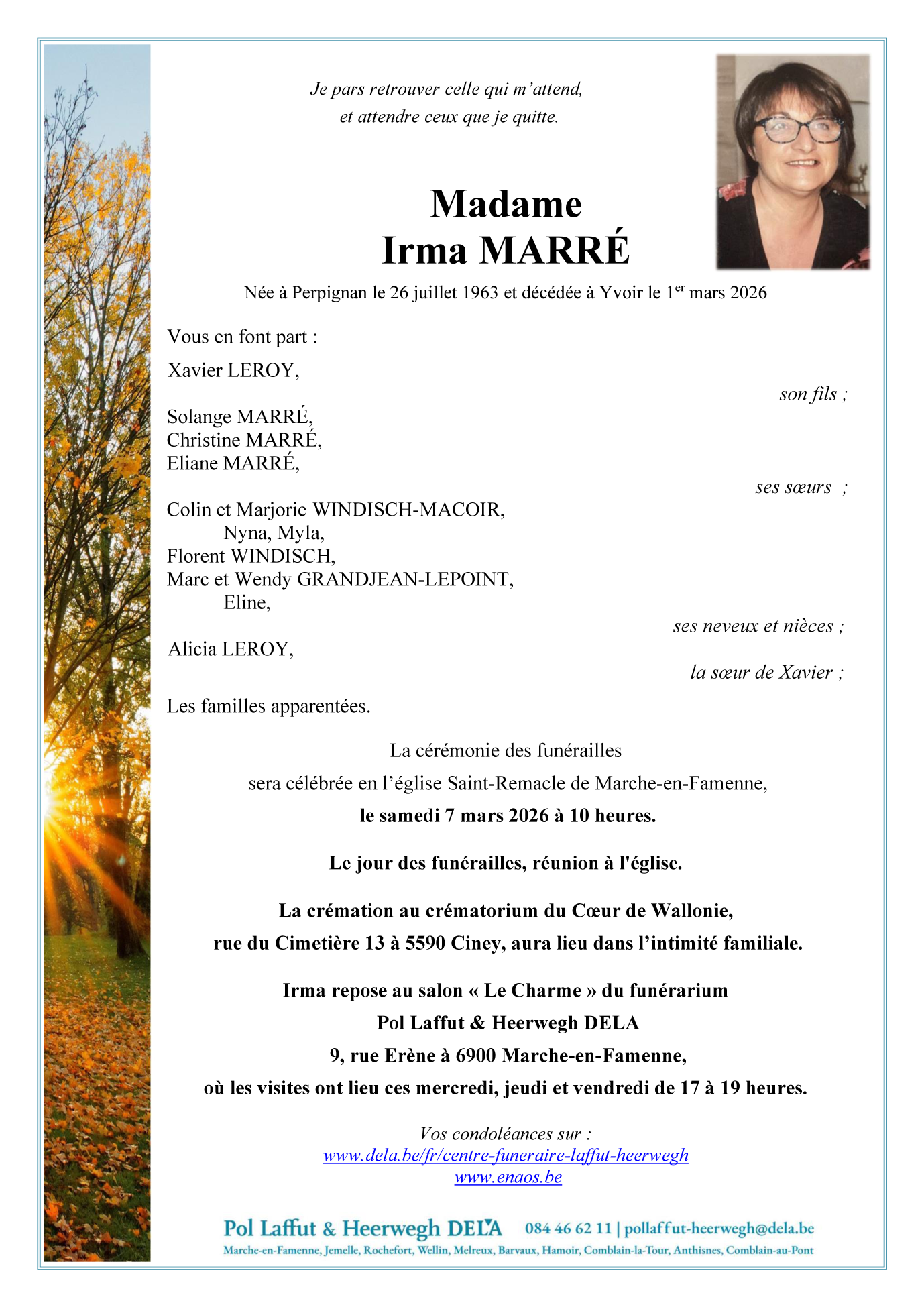 Décédée à Yvoir (5530) le dimanche 1 mars 2026 à l'âge de 62 ans