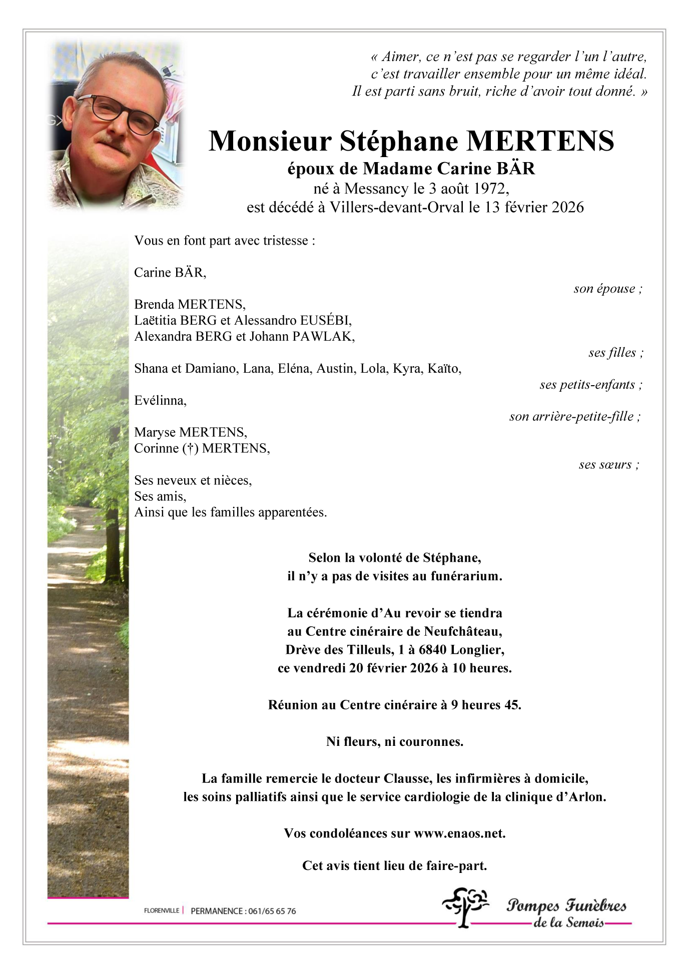 Overleden te Villers-Devant-Orval (6823) op vrijdag 13 februari 2026 op 53-jarige leeftijd