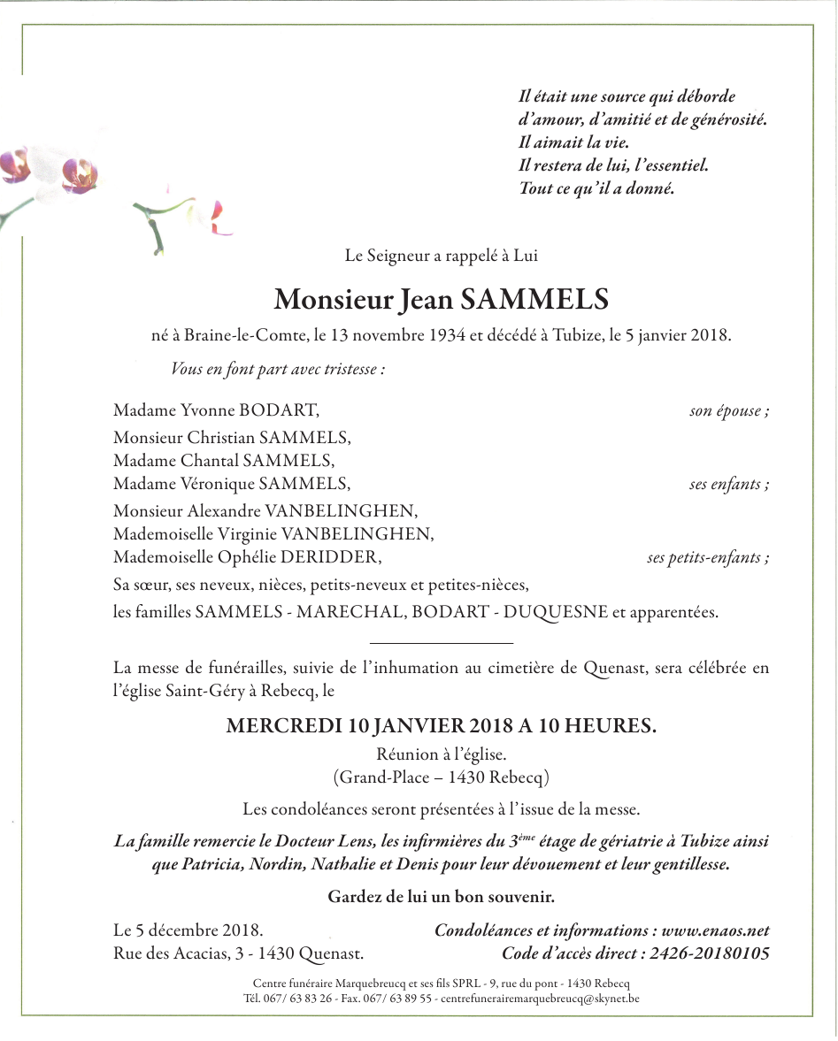 Décédé à Tubize (1480) le vendredi 5 janvier 2018 à l'âge de 83 ans