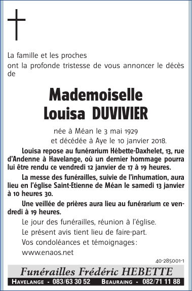 Died in Marche-en-Famenne (6900) on 10 January 2018 at the age of 88 years