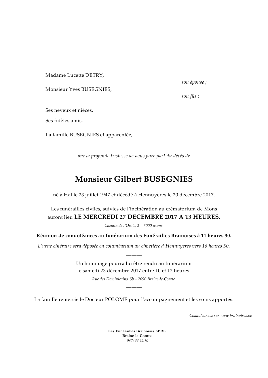 Décédé à Hennuyères (7090) le mercredi 20 décembre 2017 à l'âge de 70 ans
