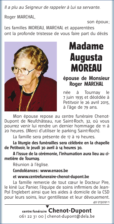 Décédée à Petitvoir (6840) le dimanche 26 avril 2015 à l'âge de 79 ans