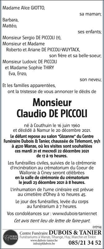 Overleden te Salzinnes (5000) op maandag 20 december 2021 op 61-jarige leeftijd