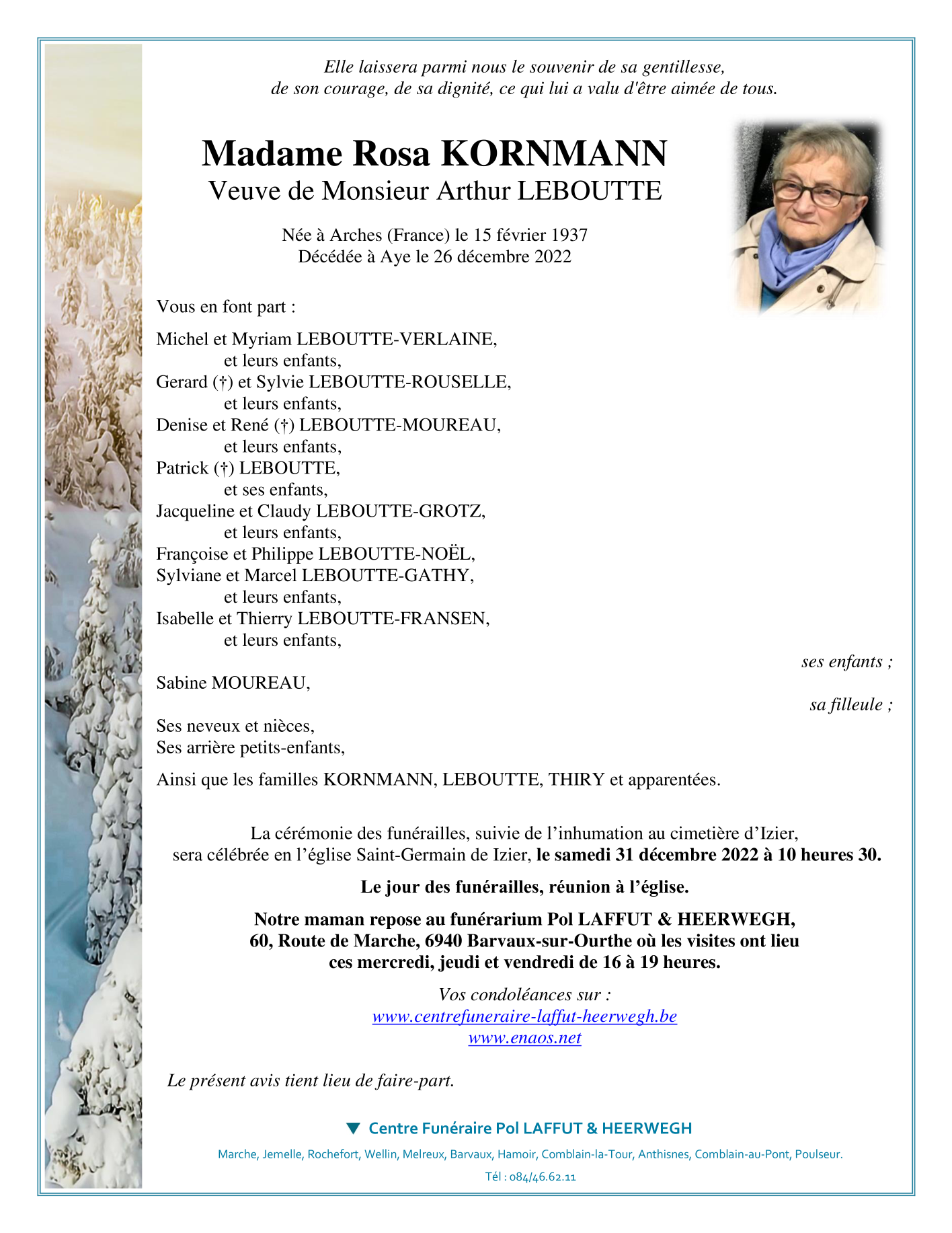 Décédée à Marche-en-Famenne (6900) le lundi 26 décembre 2022 à l'âge de 85 ans