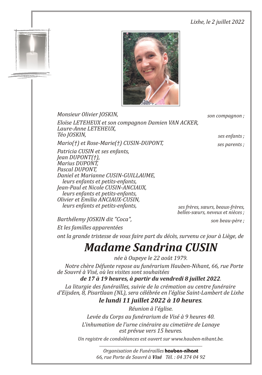 Décédée à Liège (4000) le samedi 2 juillet 2022 à l'âge de 42 ans