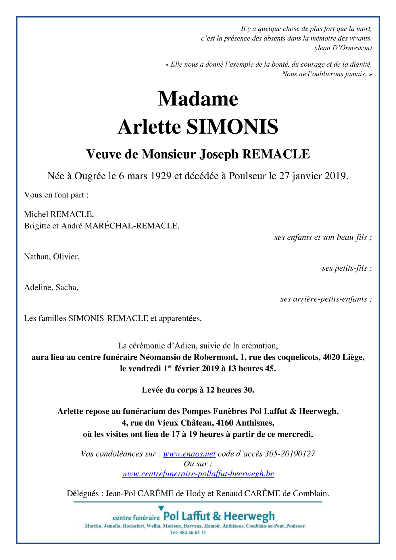 Décédée à Poulseur (4171) le dimanche 27 janvier 2019 à l'âge de 89 ans