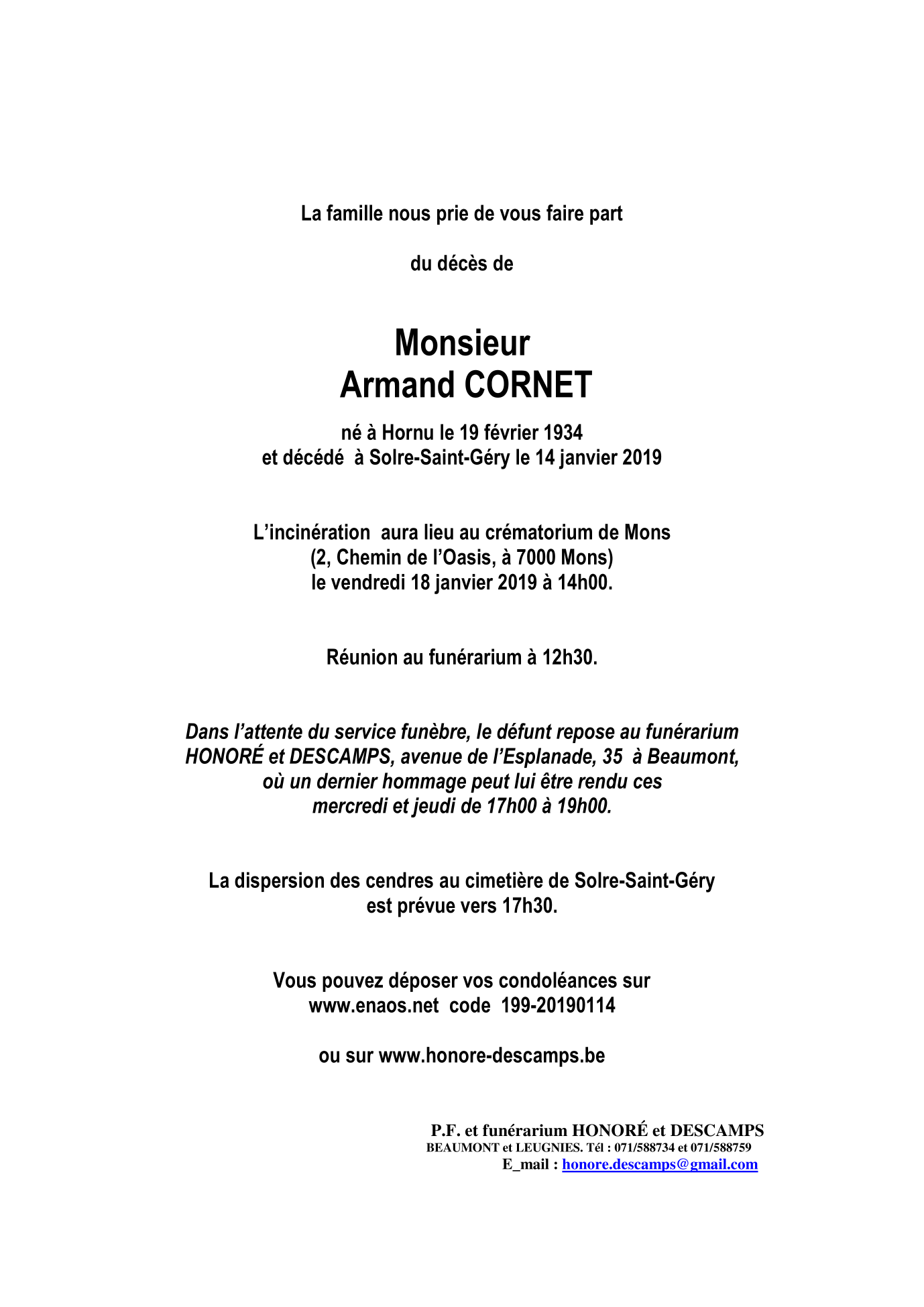 Décédé à Solre-Saint-Géry (6500) le lundi 14 janvier 2019 à l'âge de 84 ans