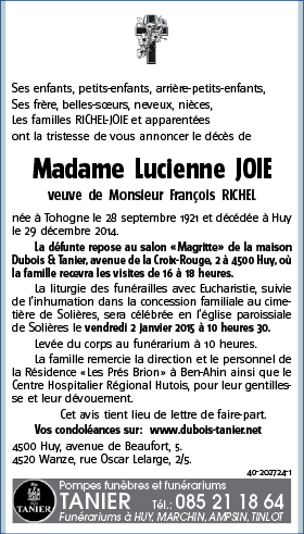 Décédée à Huy (4500) le lundi 29 décembre 2014 à l'âge de 93 ans