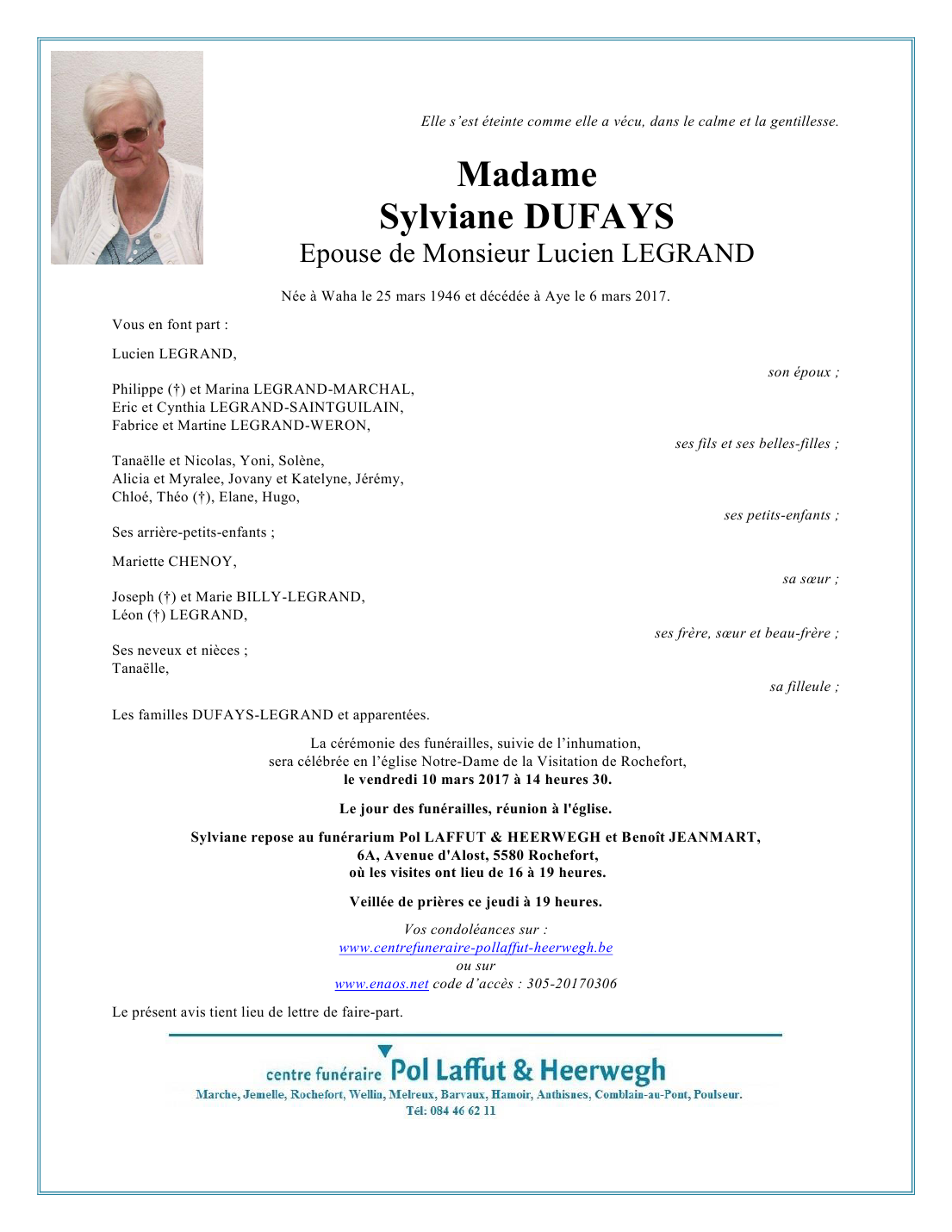 Décédée à Aye (6900) le lundi 6 mars 2017 à l'âge de 70 ans
