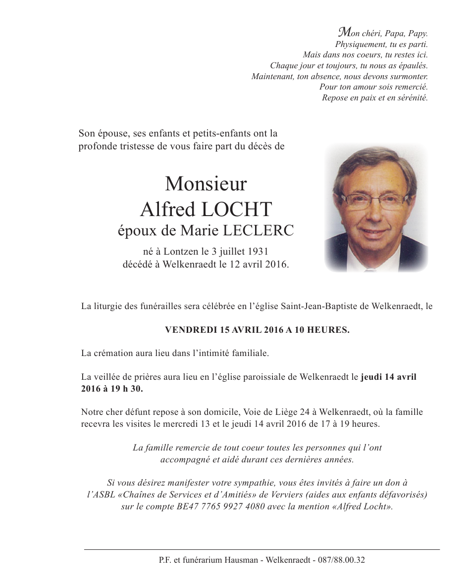 Décédé à Welkenraedt (4840) le mardi 12 avril 2016 à l'âge de 84 ans