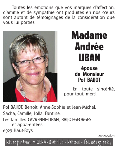 Née à Haut-Fays (6929) le mercredi 14 juin 1950