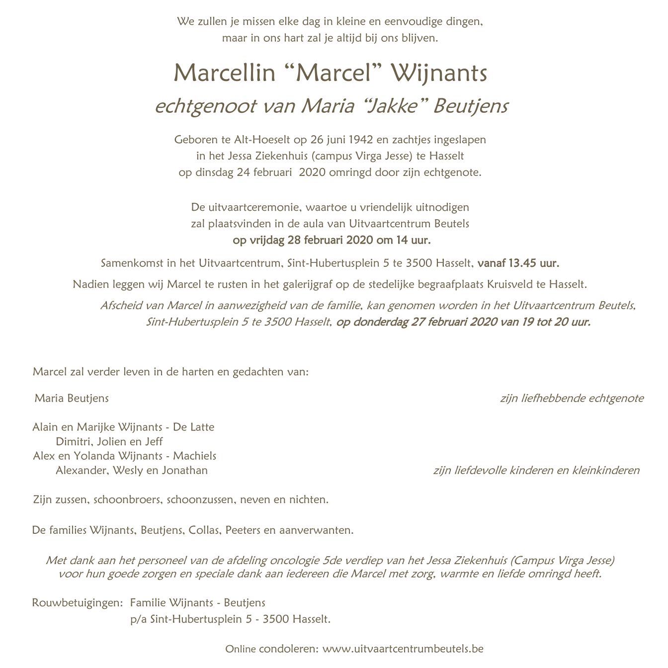 Overleden te Hasselt (3500) op maandag 24 februari 2020 op 77-jarige leeftijd