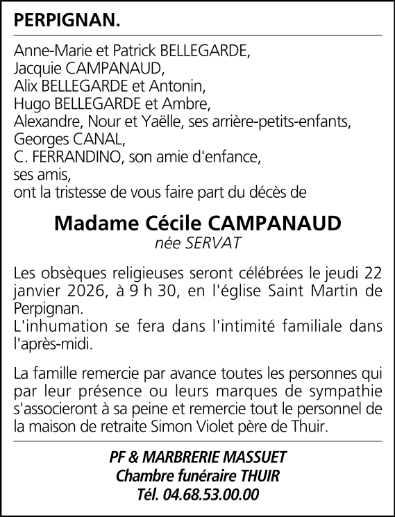 Décédée à Thuir (66300, France) le dimanche 18 janvier 2026 à l'âge de 98 ans