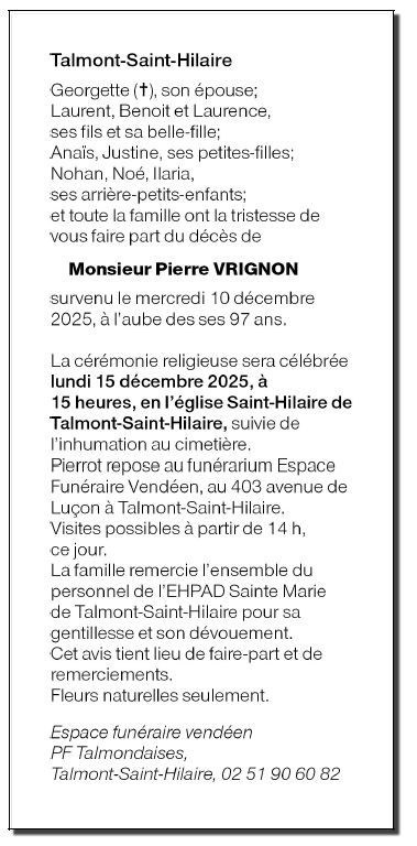 Décédé à Talmont-Saint-Hilaire (85440, France) le mercredi 10 décembre 2025 à l'âge de 96 ans