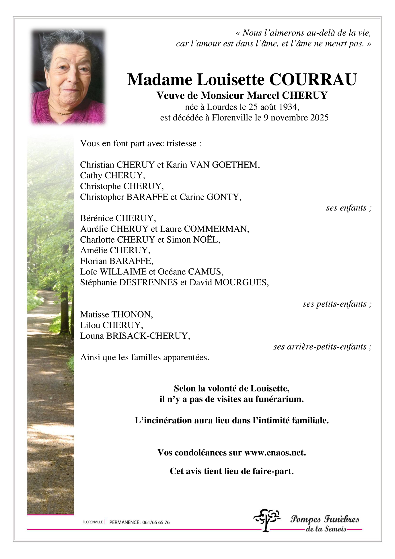 Décédée à Florenville (6820) le dimanche 9 novembre 2025 à l'âge de 91 ans