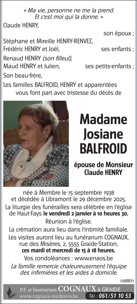 Décédée à Libramont (6800) le lundi 29 décembre 2025 à l'âge de 87 ans
