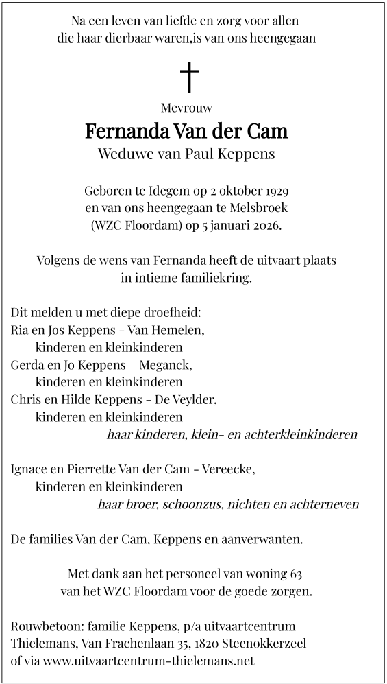 Overleden te Melsbroek (1820) op maandag 5 januari 2026 op 96-jarige leeftijd