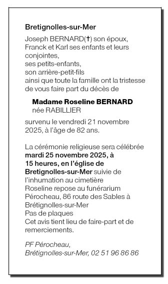 Décédée à Les Sables d'Olonne (85340, France) le vendredi 21 novembre 2025 à l'âge de 82 ans