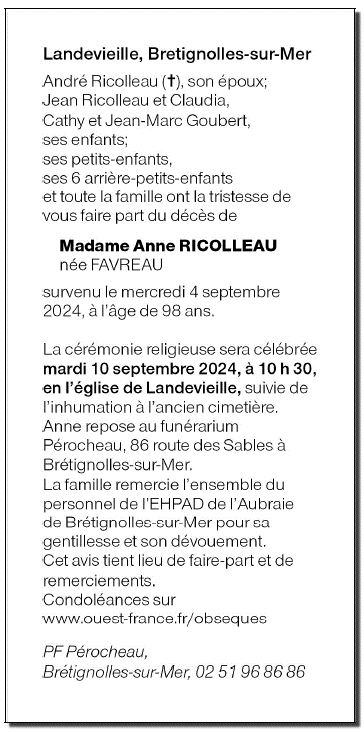 Décédée à Bretignolles-sur-Mer (85470, France) le mercredi 4 septembre 2024 à l'âge de 98 ans