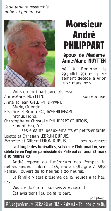 Décédé à Arlon (6700) le jeudi 24 mars 2016 à l'âge de 84 ans