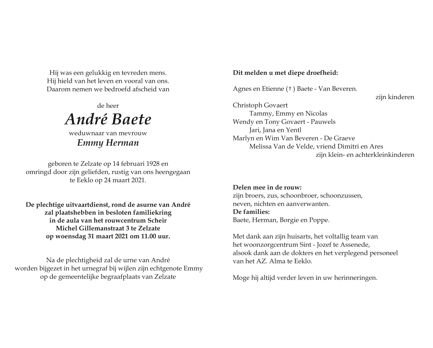 Overleden te Eeklo (9900) op woensdag 24 maart 2021 op 93-jarige leeftijd