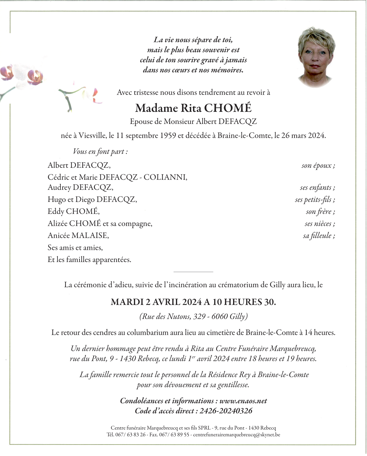 Décédée à Braine-le-Comte (7090) le mardi 26 mars 2024 à l'âge de 64 ans
