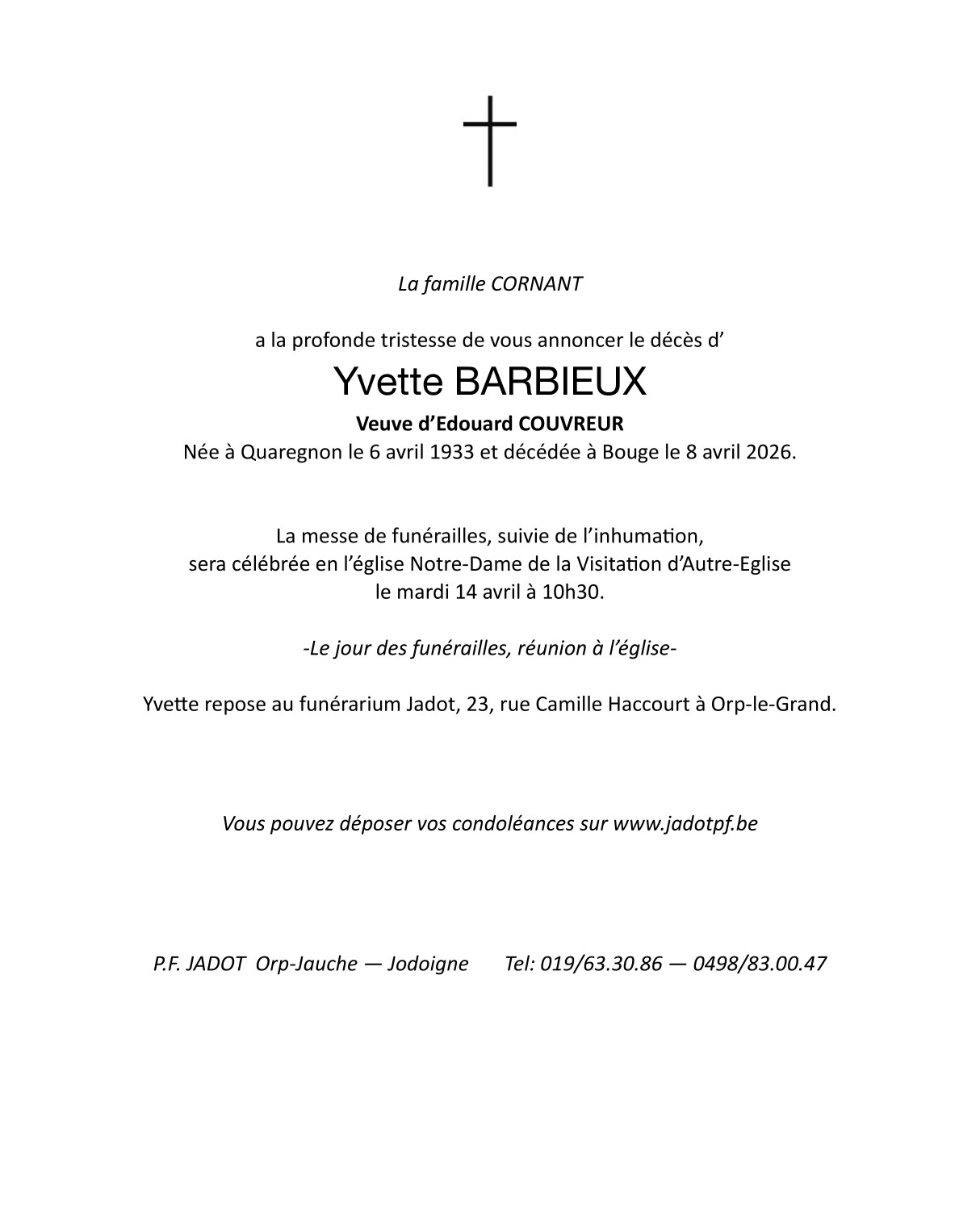 Décédée à Bouge (5004) le mercredi 8 avril 2026 à l'âge de 93 ans