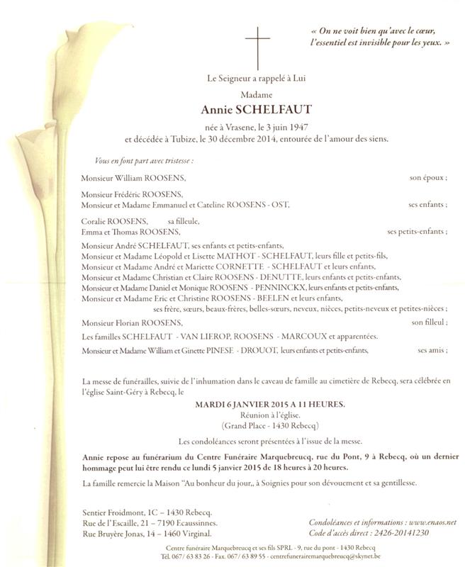 Fallecida en Tubize (1480) el martes, 30 de diciembre de 2014 a la edad de 67 años
