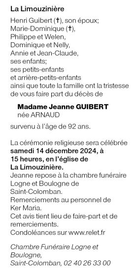 Décédée à La Limouzinière (44310, France) le mercredi 11 décembre 2024 à l'âge de 92 ans