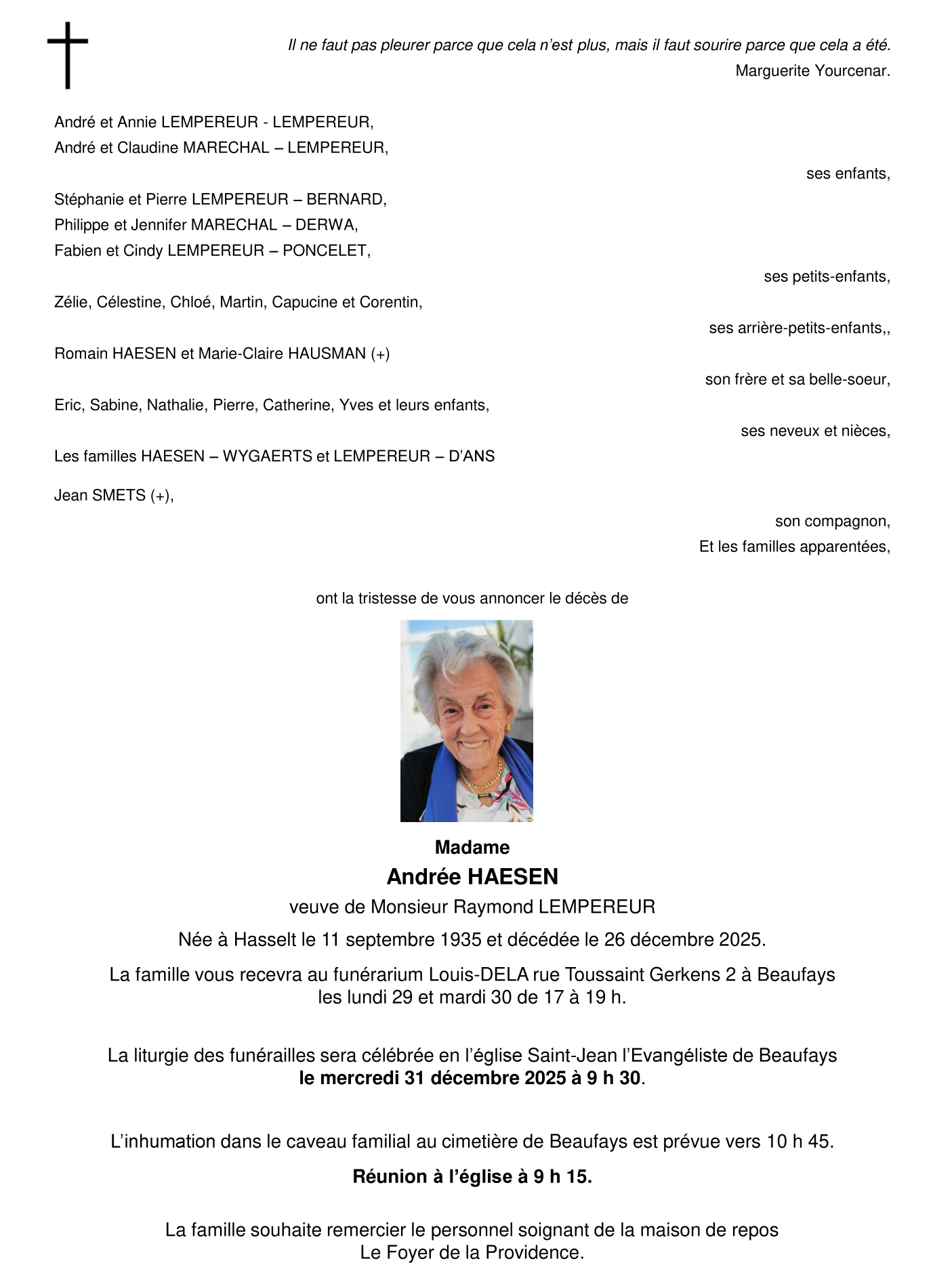 Fallecida en Beaufays (4052) el viernes, 26 de diciembre de 2025 a la edad de 90 años