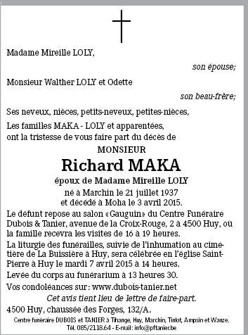 Décédé à Moha (4520) le vendredi 3 avril 2015 à l'âge de 77 ans