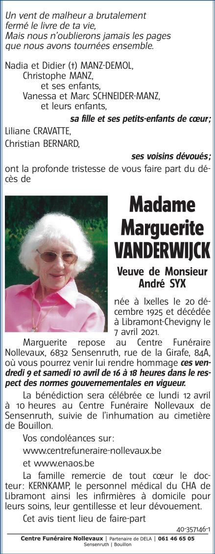 Died in Libramont (6800) on 07 April 2021 at the age of 95 years