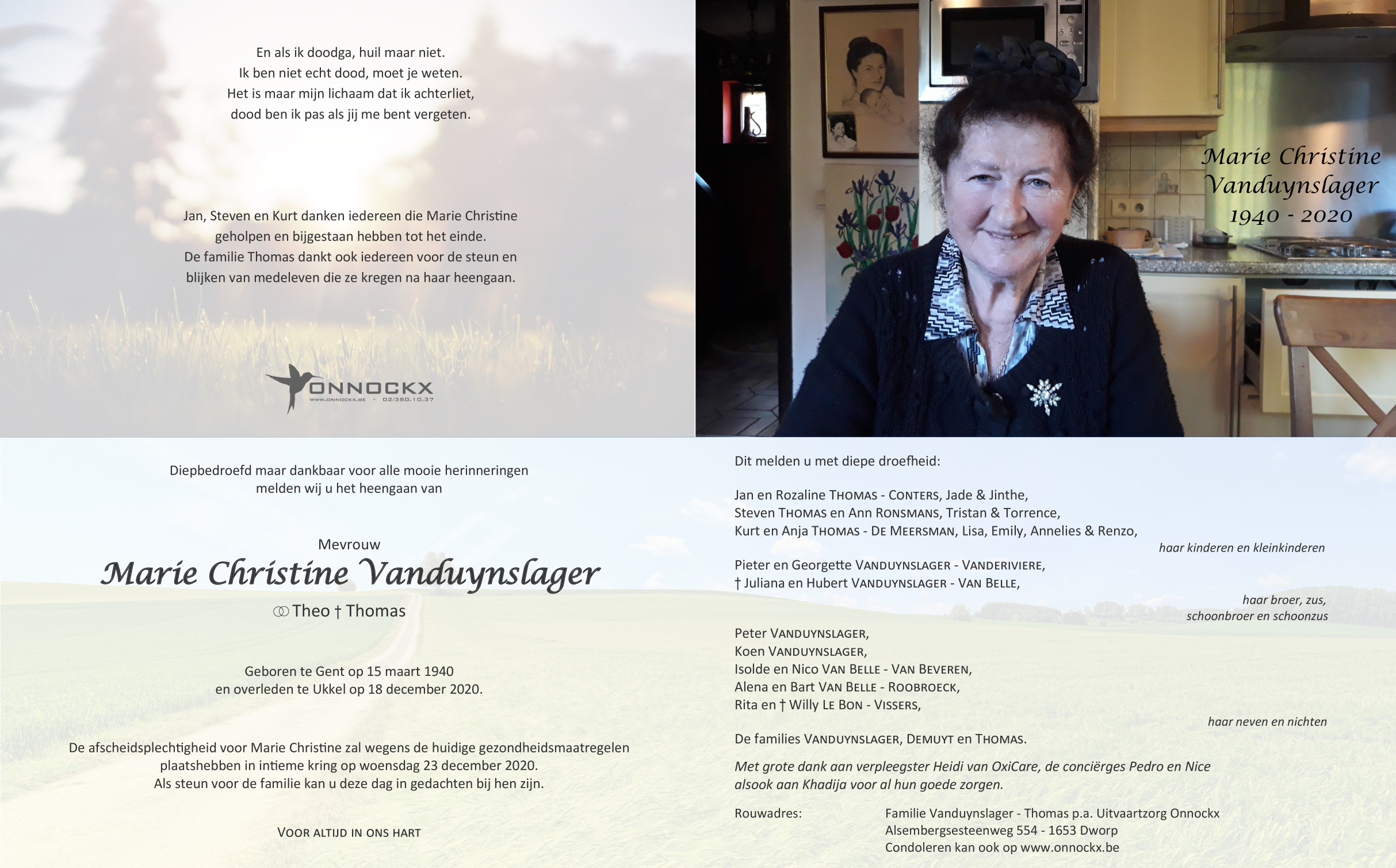 Décédée à Ukkel (1180) le vendredi 18 décembre 2020 à l'âge de 80 ans