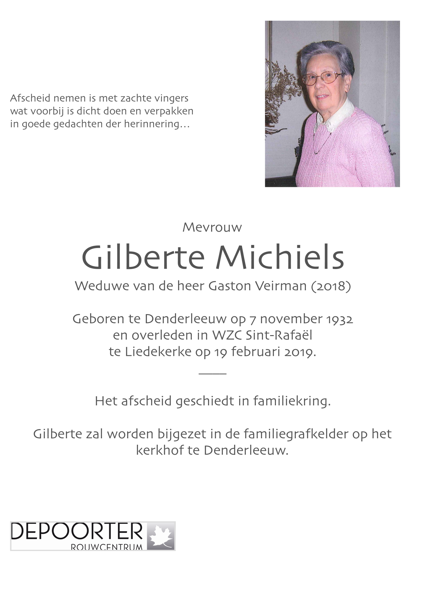 Nacida en Denderleeuw (9470) el lunes, 7 de noviembre de 1932