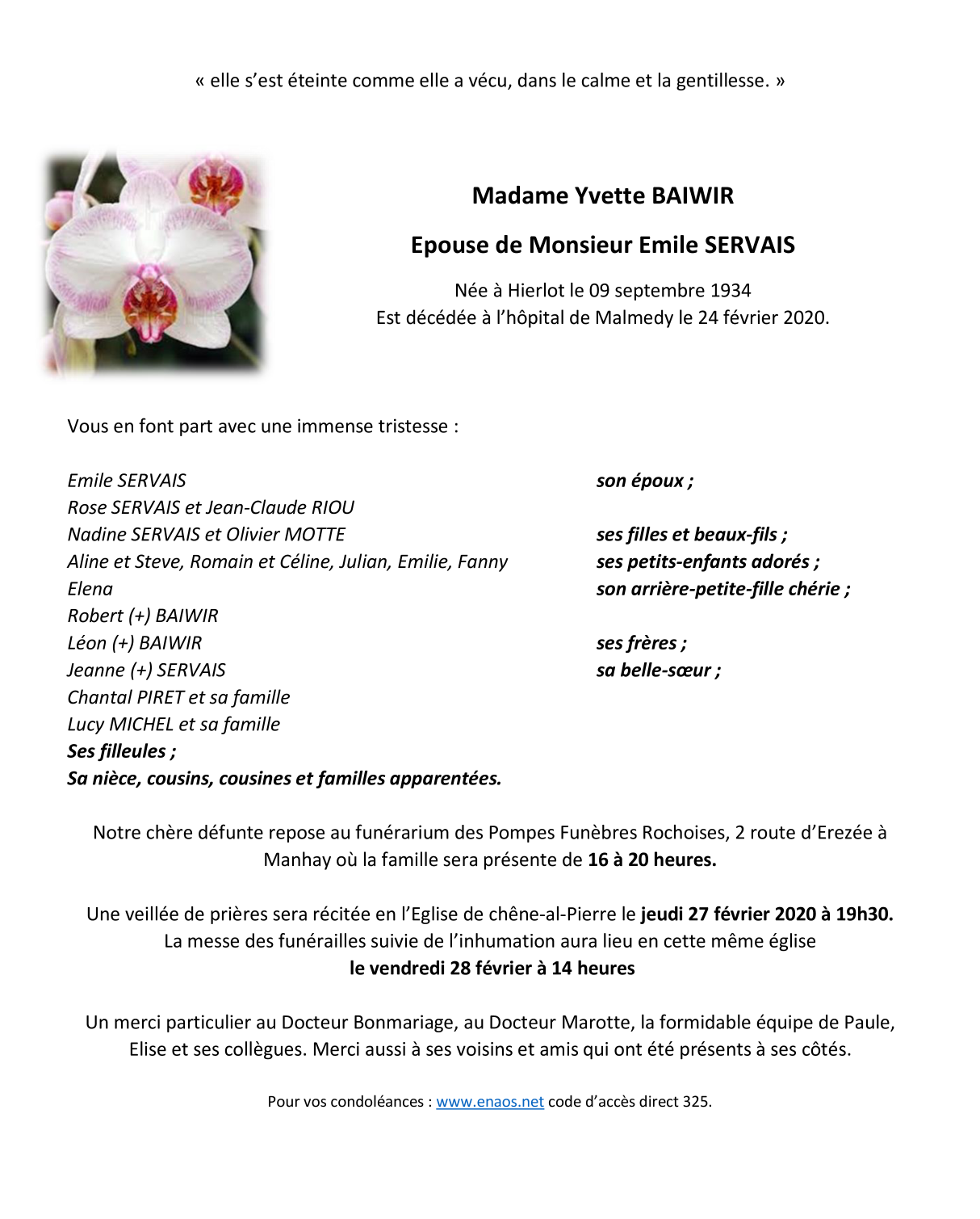 Fallecida en Malmedy (4960) el lunes, 24 de febrero de 2020 a la edad de 85 años